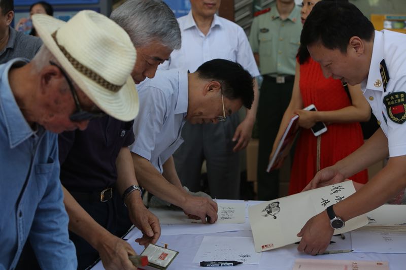 圖為2018年7月28日,為紀(jì)念建軍91周年暨改革開放40周年,由上海市國防教育辦公室主辦的“矢志改革?聚力強軍——習(xí)近平強軍論述書法作品展”在上海開幕,展覽把“改革?強軍”作為主題詞,從黨的十八大以來習(xí)近平總書記的文章、講話、批示、指示中,精選關(guān)于強軍興軍的精辟論述和名言警句,由在滬已退出領(lǐng)導(dǎo)崗位的將軍和部分在職或退役的師團領(lǐng)導(dǎo)干部,精心創(chuàng)作了154幅書法作品集中展出。圖片來源:文匯網(wǎng)