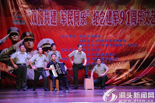 圖為2018年7月26日晚上,“雙擁共建,軍民同樂”紀(jì)念建軍91周年文藝演出在浙江省溫州市洞頭劇院舉行。在絢麗的燈光下,一個個反映建軍91周年崢嶸歲月的歌舞表演將人們帶回人民子弟兵英勇奮戰(zhàn)的光輝歲月,贊頌了軍愛民、民擁軍結(jié)成的魚水深情。圖片來源:洞頭新聞網(wǎng)
