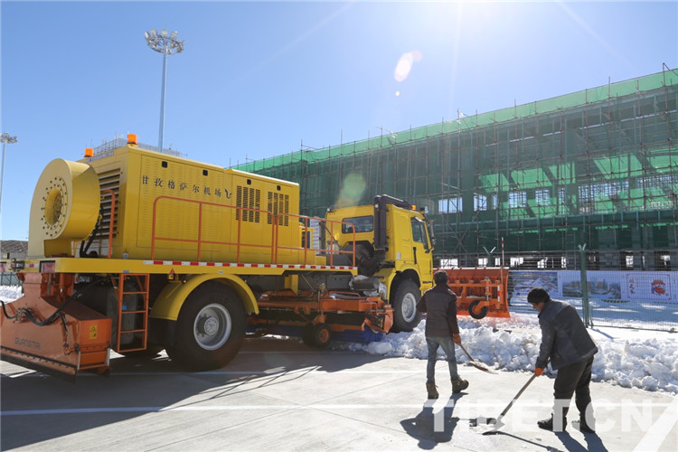 圖為工人在鏟除停機(jī)坪區(qū)域的積雪。