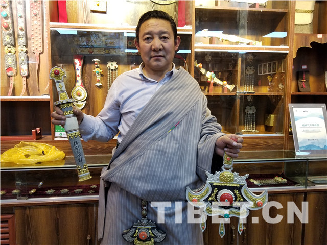 記者前年見過更求普措打制的“藏刀王”。藏刀王長約1.6米,刀鞘上鑲嵌有各種珍珠瑪瑙,造型美觀,讓人嘆為觀止。這次見他身著一身近似西藏管家的藏裝,那發(fā)型和淡淡胡子更讓感到一絲神秘。他話不多,但是展示的展品很多,最有名的還是傳承自家鄉(xiāng)稱多縣賽河鄉(xiāng)阿朵村的鐵器制品藏刀和火鐮。
