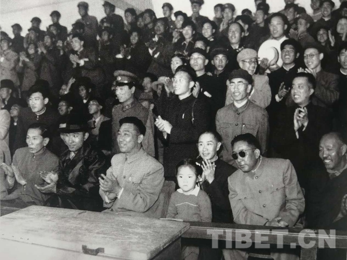圖為1959年4月17日,張經(jīng)武(一排左五)在北京陪同十世班禪(一排左二)、阿沛?阿旺晉美(一排左一)等觀看體育表演。