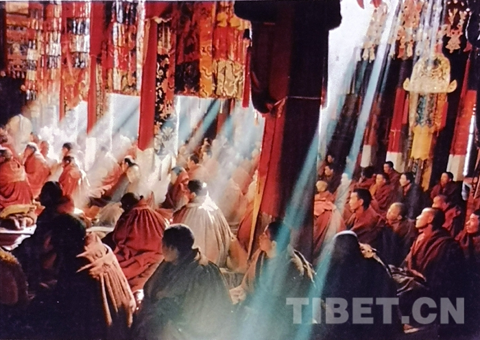 十世班禪大師到哲蚌寺進行佛事活動時,受到廣大僧眾的熱烈歡迎,1982年。劉麗嘉攝