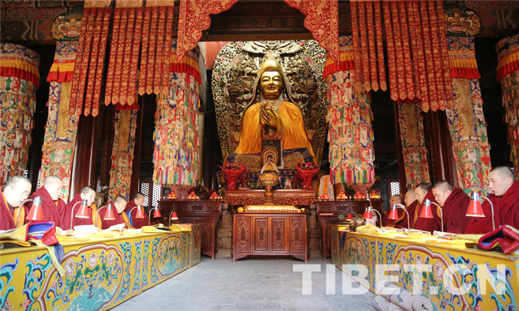 圖為僧人端坐于宗喀巴大師像兩側(cè)誦經(jīng)。