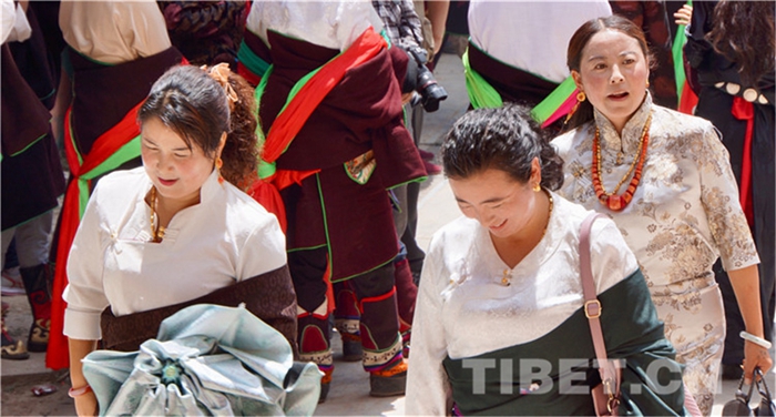 六月會(huì)期間有多場(chǎng)舞蹈表演,參與者是年輕的未婚女子,她們穿上最隆重的藏袍,綴上珊瑚蜜蠟松石銀飾,精施粉黛,莊重優(yōu)雅地舉手抬步緩行。舞蹈的動(dòng)作簡(jiǎn)單緩慢,但是女孩子們個(gè)個(gè)奪目。