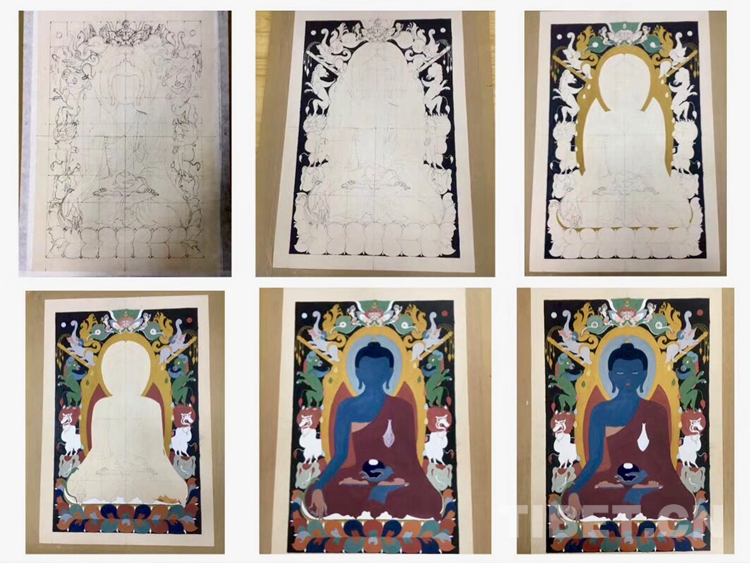 第三步:素描及設色。素描輪廓的依據(jù)是“圣跡圖像學”,那是圣賢們在冥想中觀想到的各種神祗的容貌、各種神獸的形象,并記錄下來匯集成冊。畫師必須嚴格按照上面記載的人物樣貌、裝飾物、顏色來作畫,就連各種神獸所在的位置也完全不能有誤。