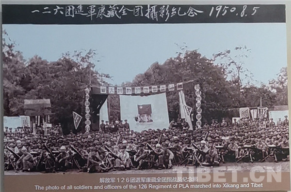 在中國共產(chǎn)黨和中央人民政府提出和平解放西藏的方針,中國人民解放軍第18軍迅速做好向西藏昌都地區(qū)進(jìn)發(fā)的各項(xiàng)戰(zhàn)斗準(zhǔn)備的同時(shí),云南軍區(qū)第14軍126團(tuán)在沿途人民的援助下,于當(dāng)年7月進(jìn)抵云南德欽,作好了向西藏進(jìn)軍的準(zhǔn)備。圖為中國人民解放軍126團(tuán)進(jìn)軍康藏全團(tuán)指戰(zhàn)員紀(jì)念照
