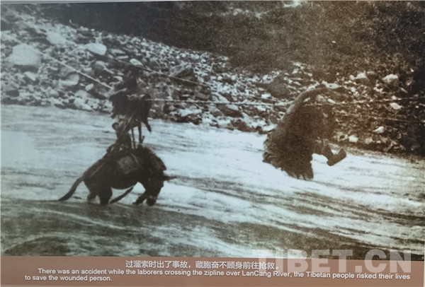 進(jìn)軍途中,因“大理至麗江段土工已完成百分之八十,但路基及橋梁,尚未建筑”,在運(yùn)送物資時(shí)會使用當(dāng)?shù)亓锼鬟^江。圖為過溜索時(shí)出了事故,藏族群眾奮不顧身去搶救