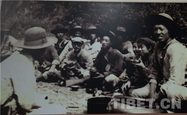 入藏途中,“維西以外至科麥段,須連續(xù)通過高山大河,該區(qū)人煙稀少,糧食困難。”圖為羊咱的藏族同胞自發(fā)送食品慰勞援藏運(yùn)輸隊(duì)民工