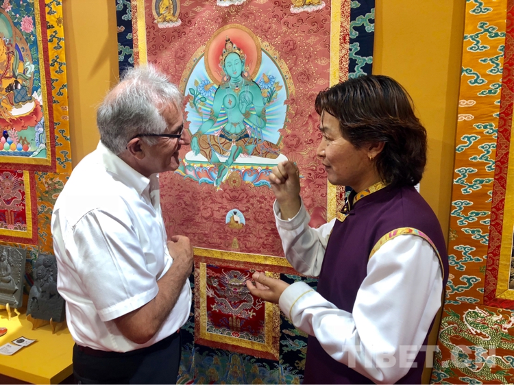 圖為國(guó)家一級(jí)作家、文化學(xué)者雪漠(左)與熱貢藝術(shù)傳承人格桑嘉措(右)在展區(qū)交流 攝影:尼知加