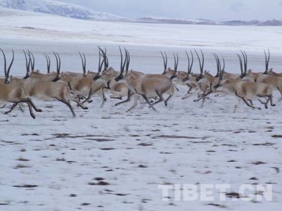 圖為奔跑在羌塘國(guó)家級(jí)自然保護(hù)區(qū)的國(guó)家一級(jí)保護(hù)動(dòng)物藏羚羊。(唐召明2006年10月24日攝)