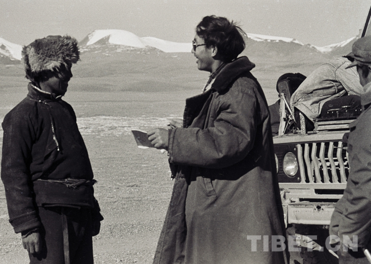 圖為唐召明獨(dú)自“二闖”藏北無人區(qū)時(shí),所搭乘的那曲科委風(fēng)能實(shí)驗(yàn)站汽車在路途中“拋錨”,趁司機(jī)索加修車空擋,唐召明(右)采訪給他騰讓駕駛室車座,而不顧自己疑似有癲癇疾病,一路在汽車車廂里受凍的索加弟弟才旺(左)。(圖片由唐召明提供,1988年11月14日攝)