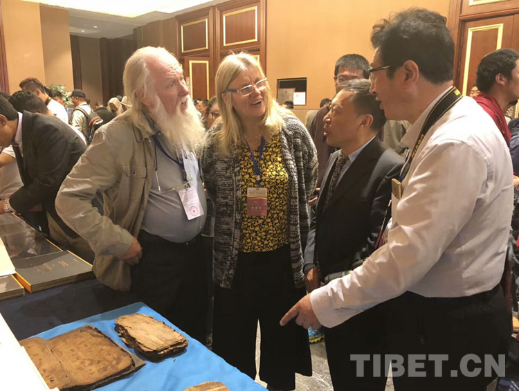圖為洛賽向外國學(xué)者介紹古藏文經(jīng)卷 圖片由洛賽提供