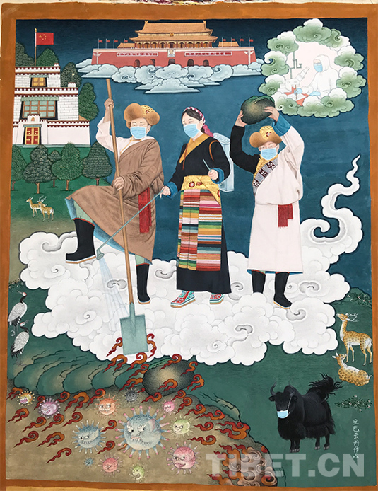 中國(guó)西藏網(wǎng)訊 一幅60cm*45cm的畫布上,一位身著藏族服飾的阿佳正戴著口罩噴灑消毒液。這并不是普通的繪畫作品,而是西藏唐卡畫師旦巴云丹耗時(shí)一個(gè)多月繪制的戰(zhàn)“疫”主題唐卡。