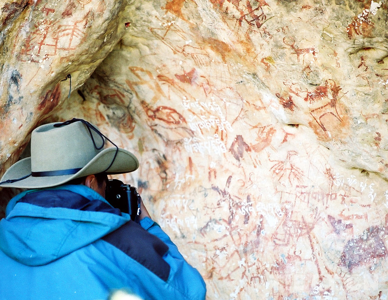 這是藏北高原無人區(qū)科考人員在考察溶洞巖畫(唐召明2001年攝)