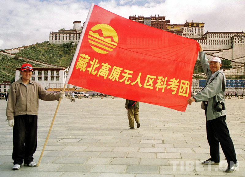 這是唐召明在隨藏北高原無人區(qū)科考團出征時,展隊旗拍照留念(唐召明提供,2001年攝)