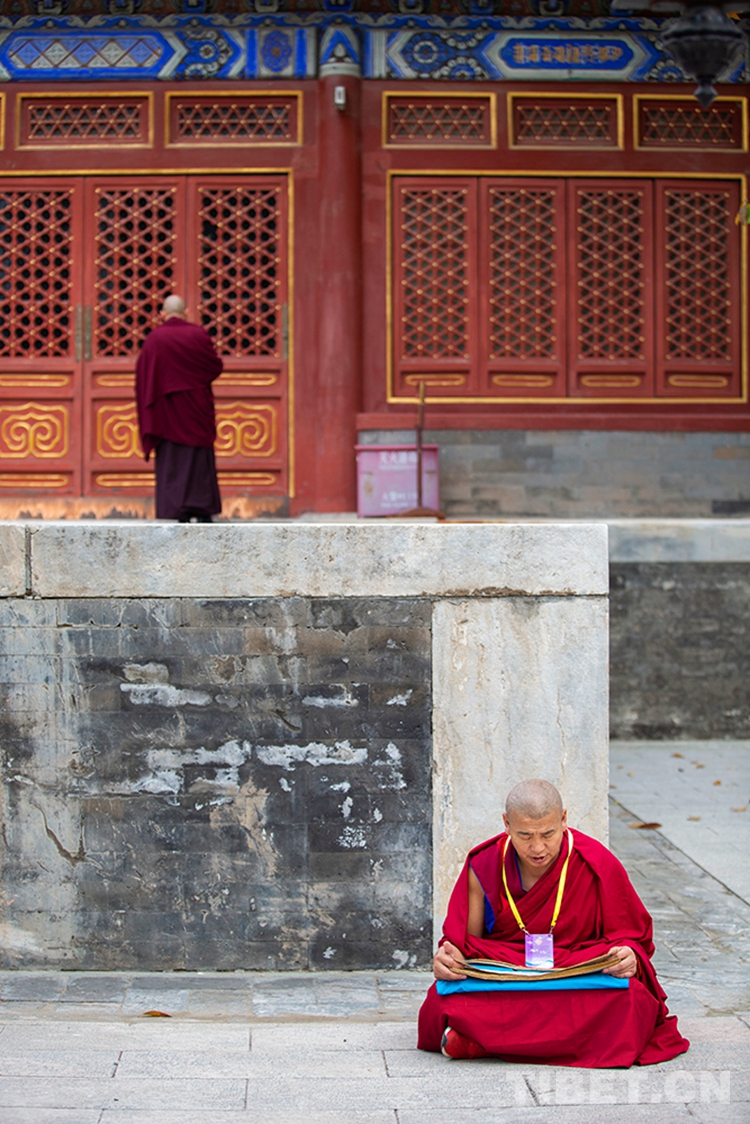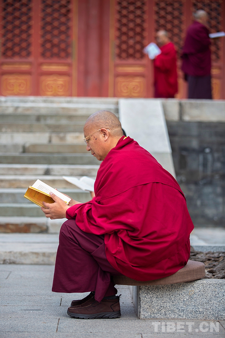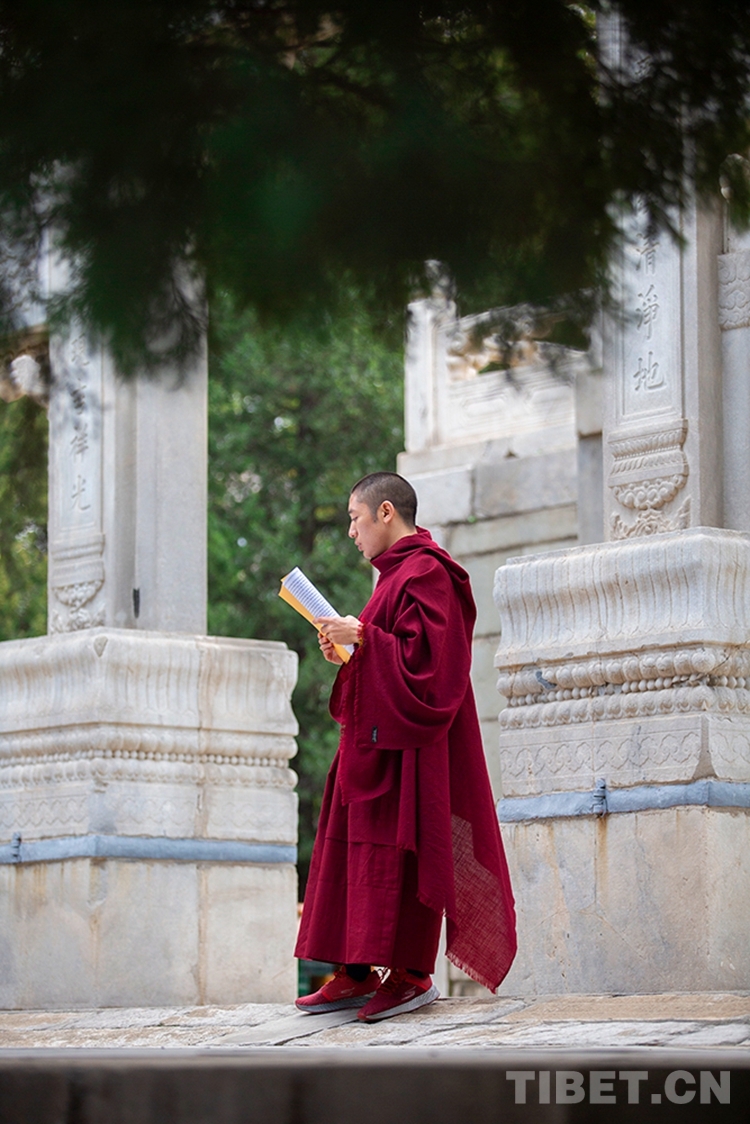 中國(guó)西藏網(wǎng)訊 10月29日,深秋的清晨,位于北京西黃寺的中國(guó)藏語系高級(jí)佛學(xué)院內(nèi),古柏蒼蒼,清凈肅穆。還有半個(gè)小時(shí),2020年藏傳佛教第十六屆“拓然巴”高級(jí)學(xué)銜畢業(yè)考試辯經(jīng)考試就將準(zhǔn)時(shí)開始。等待參加辯經(jīng)考試的學(xué)僧們,正在西黃寺大殿前誦經(jīng),抓緊時(shí)間為考試進(jìn)行最后的準(zhǔn)備。大家或席地而坐,或立定一隅,或踱步前行,梵唱聲聲,余音繞梁。(中國(guó)西藏網(wǎng) 攝影/許娜 編輯/周晶)