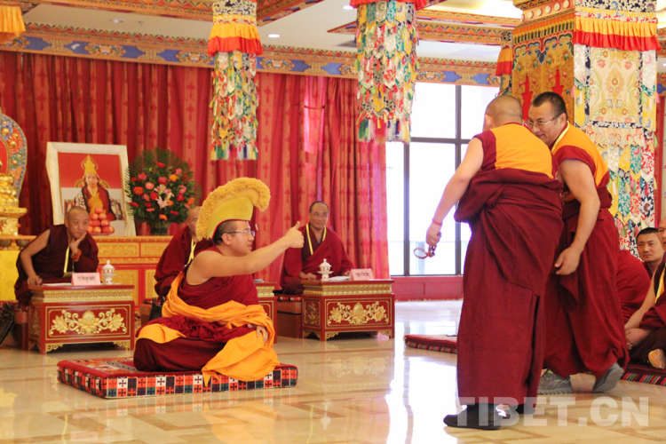 被主考官點(diǎn)名上場(chǎng)的考僧,身披黃色法衣,結(jié)跏趺坐于考場(chǎng)正中佛墊,屏氣凝神。提問辯經(jīng)人員用“諦……”聲提示“舌戰(zhàn)”開始,并在考場(chǎng)上來回走動(dòng)間口若懸河、滔滔不絕,即興向考僧提問。提問過程中,辯經(jīng)人員常會(huì)借助各種手勢(shì)來增強(qiáng)辯論的力度。如右手甩念珠,快速跨步向前,高舉右手,用力擊掌,聲如裂石,令人振奮??忌仨毤芯?,意志堅(jiān)定,沉著應(yīng)戰(zhàn)。不得不說,雙方常會(huì)言辭激烈,爭(zhēng)辯得面紅耳赤,這種情況下,仍能夠從容不迫、應(yīng)答得體的佼佼者才能得到認(rèn)可,脫穎而出。