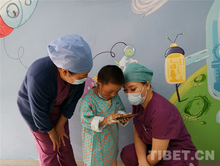 在記者采訪過程中,呷瑪龍刀尼瑪閑不住地跑來跑去,一會兒跑去看病友妹妹呷絨拉姆有沒有乖乖睡覺,一會兒又拿起舅舅的手機(jī)刷小視頻,還熱情地分享給護(hù)士看。