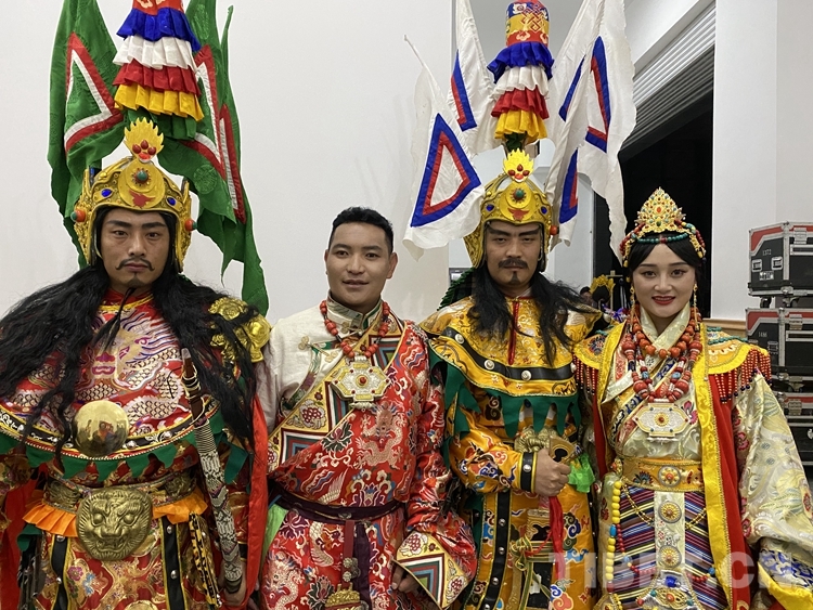 圖為斯塔多吉(左二)準(zhǔn)備表演格薩爾史詩片段