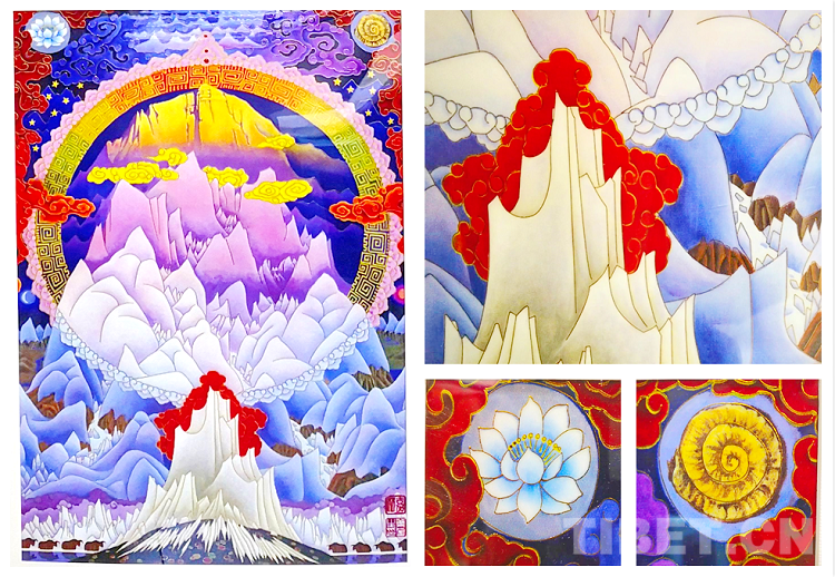 而令葉星生深受觸動的,是十世班禪大師對創(chuàng)作的關(guān)心、前衛(wèi)的創(chuàng)作思路和嚴格的要求。“十世班禪大師多次提出指導(dǎo)意見,鼓勵我們大膽創(chuàng)新,要融入光影等繪畫新技法及漢族傳統(tǒng)繪畫技法,使珠峰更有立體感,使畫作成為現(xiàn)代藝術(shù)技法與藏族傳統(tǒng)繪畫手法相融合的代表,成為民族團結(jié)的象征。所以,這幅畫在結(jié)構(gòu)上參考了唐卡,比如彩虹;祥云、太陽、月亮、星斗對稱的方式等來自西藏傳統(tǒng)壁畫藝術(shù);但在光線、明暗對比等方面加入了漢地工筆重彩,甚至西方的藝術(shù)手法。在天地之間以更加立體的視角展現(xiàn)出了珠峰壯麗雄偉的全景。”