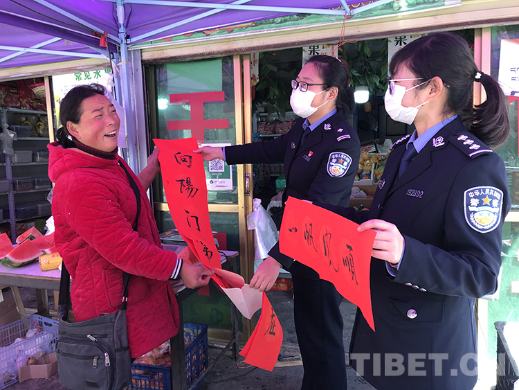 2月7日,拉薩邊檢站邀請(qǐng)拉薩市文聯(lián)書法家協(xié)會(huì)共同開展“同心同書——祖國新春好”送萬福進(jìn)萬家活動(dòng)。4名書法家揮毫潑墨,書寫漢文藏文春聯(lián),散發(fā)著墨香的春聯(lián)凝聚著無限的祝福。隨后,邊檢站格桑花女子執(zhí)勤隊(duì)民警為駐地商戶送“?!彼痛郝?lián)。在駐地的一家超市,商戶張大姐興高采烈地與民警一邊貼春聯(lián),一邊笑著說:“感謝你們送來的新春祝福。今年雖然沒能回家過年,但有你們的陪伴照顧,我們感到很開心?!?/p>