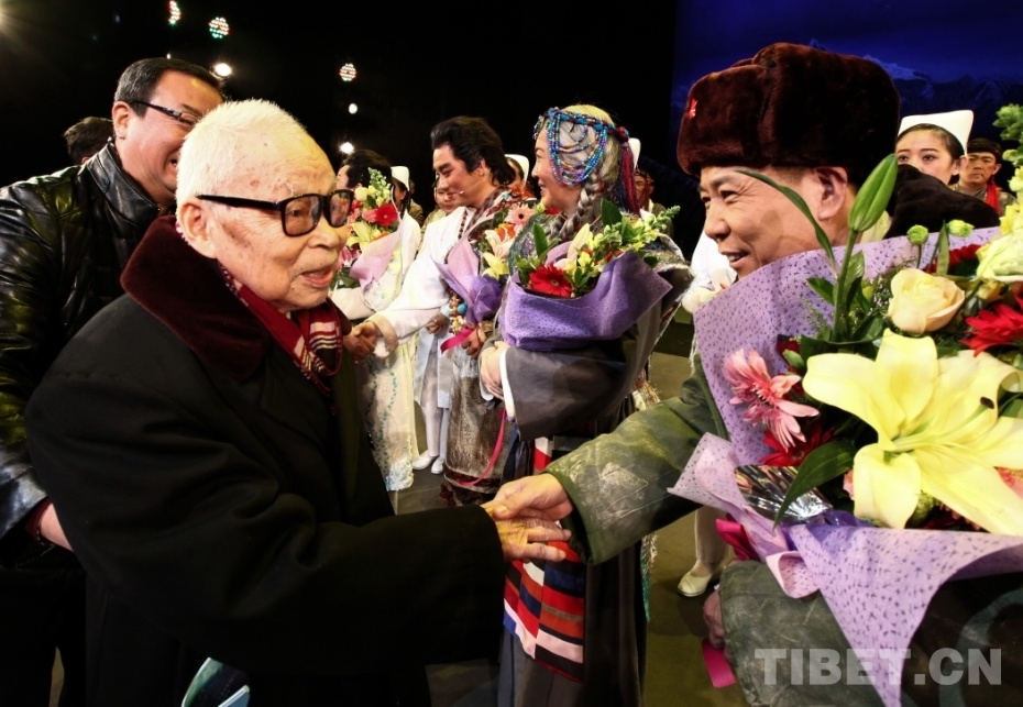 圖為北京建藏援藏工作者協(xié)會(huì)學(xué)習(xí)指導(dǎo)老師陰法唐將軍在中國(guó)評(píng)劇院所創(chuàng)作的評(píng)劇《藏地彩虹》試演結(jié)束后,上臺(tái)握手祝賀(唐召明2017年12月10日攝)