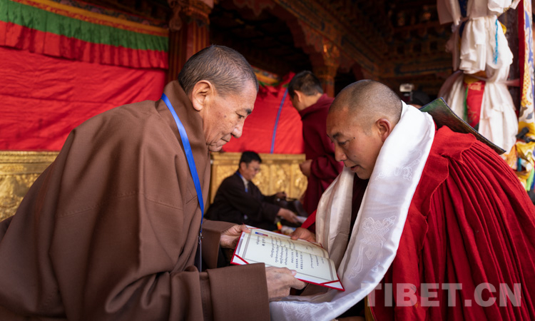 圖為中國(guó)佛教協(xié)會(huì)西藏分會(huì)常務(wù)副會(huì)長(zhǎng)珠康·土登克珠活佛(左)向考僧頒發(fā)學(xué)位證書 攝影:趙耀