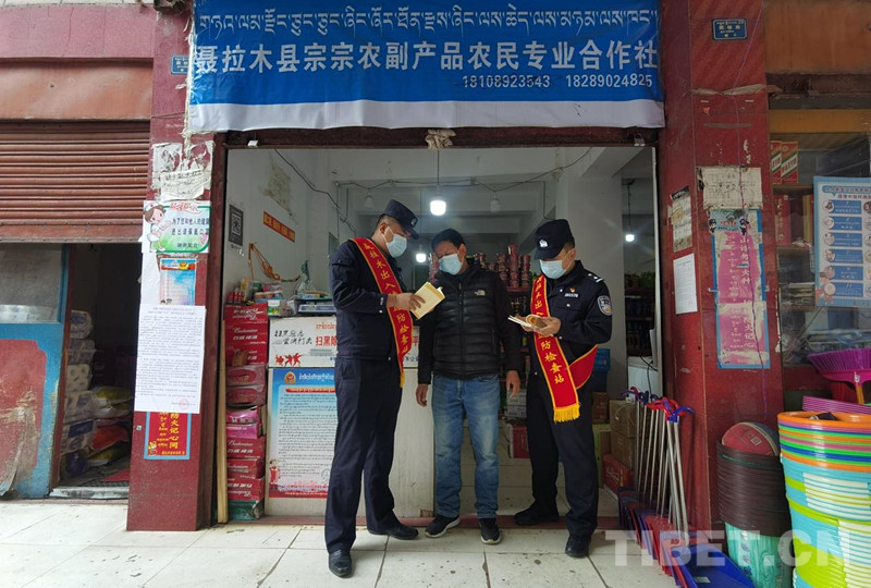 “當你們遇到有危害公共安全的行為時,一定要第一時間舉報?!甭櫪境鋈刖尺叿罊z查站民警達瓦次仁一邊給工人發(fā)宣傳單一邊說道。