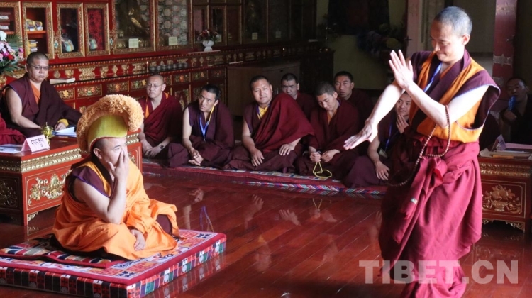 圖為薩迦派辯經(jīng)考試現(xiàn)場(chǎng)