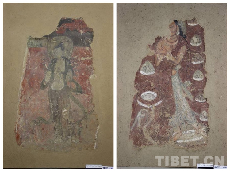 圖為修復(fù)后的表層壁畫(左)和修復(fù)后的底層壁畫(右)。原藏于甘肅武威天梯山石窟第 4 窟中心柱,現(xiàn)為武威市天梯山石窟保護(hù)研究所藏