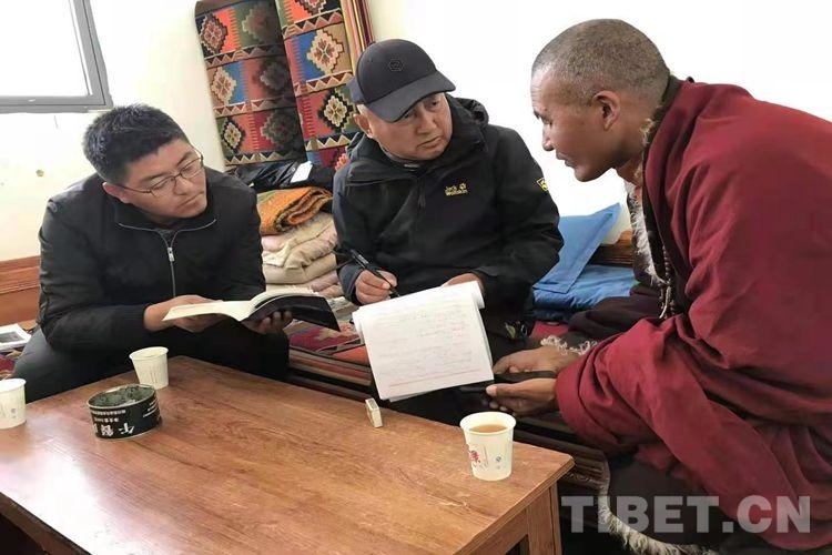 圖為西藏自治區(qū)藏語委辦(編譯局)黨組成員、副主任(副局長)加永曲加和同事調(diào)研新詞術(shù)語相關(guān)情況