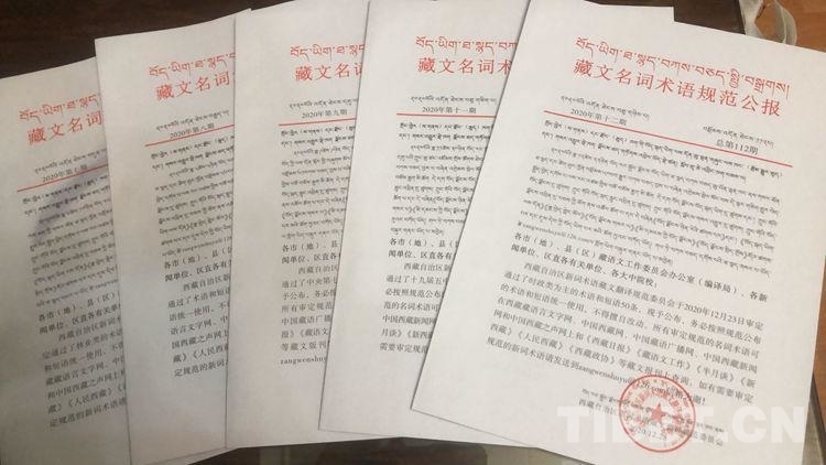 西藏自治區(qū)新詞術(shù)語藏文翻譯規(guī)范委員會(huì)每年收集、整理、審定不少于600條,每月召開一次審定會(huì)及時(shí)進(jìn)行審定規(guī)范。審定通過的規(guī)范術(shù)語以公報(bào)活頁形式呈西藏自治區(qū)省級(jí)負(fù)責(zé)同志,報(bào)送全國藏語術(shù)語標(biāo)準(zhǔn)化委員會(huì),下發(fā)區(qū)內(nèi)各地市編譯機(jī)構(gòu)和區(qū)直新聞、院校等各有關(guān)單位及部分專家,發(fā)送到涉藏州縣編譯系統(tǒng)、民語委和北京等地有關(guān)藏語文部門,同時(shí)刊登在西藏藏語言文字網(wǎng)、中國藏語廣播網(wǎng)等藏文網(wǎng)站和報(bào)刊。