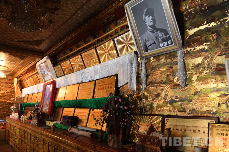 圖為寺廟懸掛著西藏自治區(qū)級、市級、縣級和諧模范寺廟、愛國愛教寺廟等榮譽獎牌,以及前西藏軍區(qū)司令員、十八軍軍長張國華的照片 攝影:索南多杰