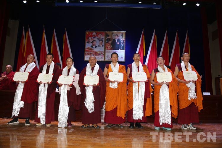 畢業(yè)典禮上,學(xué)院第三屆預(yù)備班111名學(xué)員被授予“聶當(dāng)?禪然巴”初級學(xué)銜,2017級學(xué)制班130名學(xué)員被授予“智然巴”中級學(xué)銜,其中密宗班33名學(xué)員,由中國佛教協(xié)會西藏分會與西藏佛學(xué)院,共同授予“聶當(dāng)?額然巴”學(xué)銜。