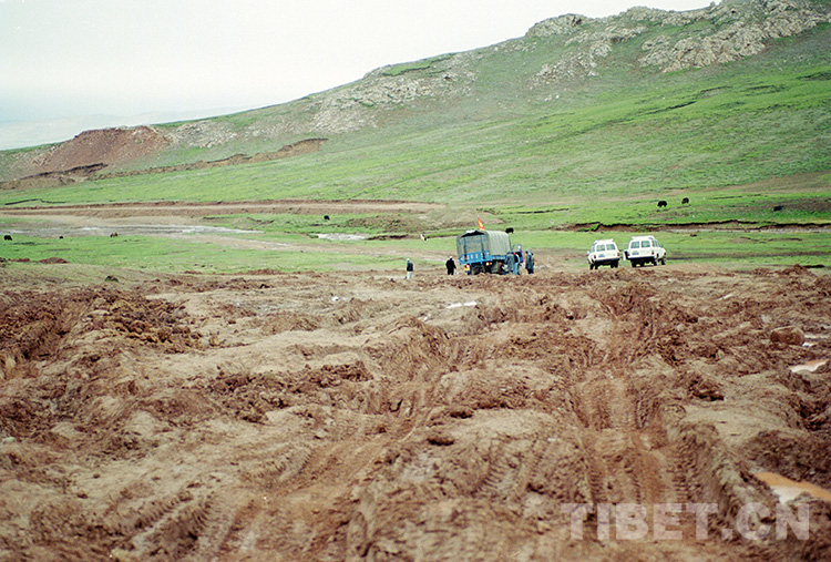 過(guò)去,由于交通不便,從班戈縣通往雙湖辦事處(現(xiàn)雙湖縣)的草原路,汽車(chē)常遭遇陷車(chē)等困難。這是過(guò)去汽車(chē)通過(guò)的一段泥濘路(唐召明2001年攝)