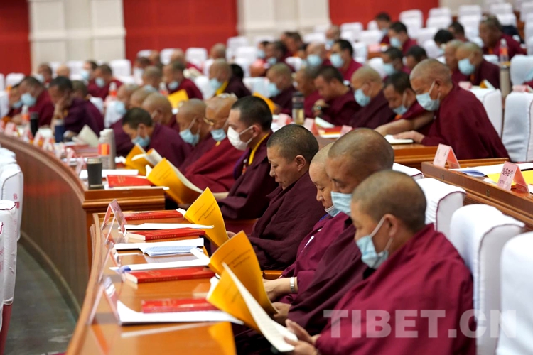班禪強(qiáng)調(diào),要將闡釋成果充分運(yùn)用到宣講中,深入開展大眾化闡釋,以愛國主義精神鼓舞僧尼和信教群眾,以團(tuán)結(jié)進(jìn)步、積極向上的精神引導(dǎo)僧尼和信教群眾,以高尚的情操教育僧尼和信教群眾,力求使闡釋工作更加符合我國社會發(fā)展要求,更加貼近藏傳佛教實(shí)際,更加深入廣大寺廟僧尼和信教群眾的生活。