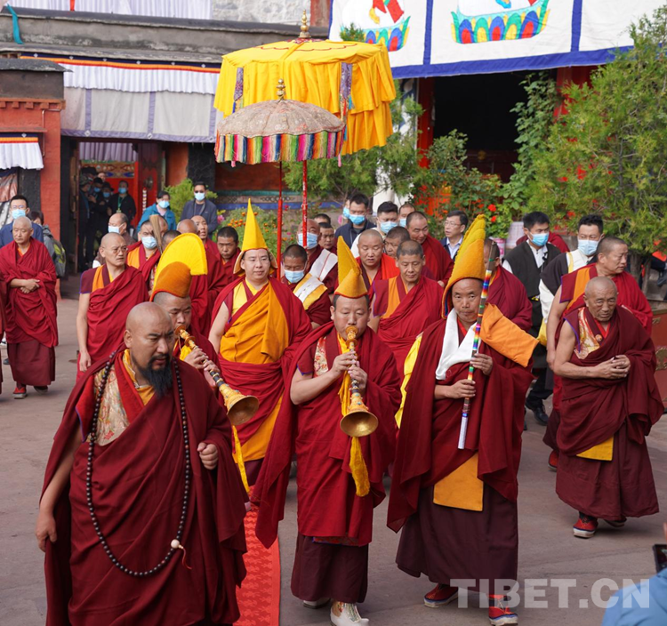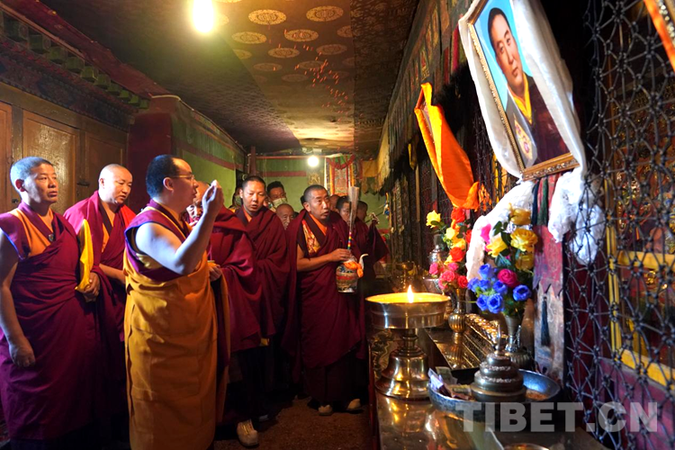 8月9日上午,按照宗教儀軌,在手持香爐和吹嗩吶僧人的引領(lǐng)下,班禪逐一朝拜了釋頌?zāi)辖蒽`塔殿、強(qiáng)巴佛殿等扎什倫布寺主要佛殿,每到一處佛殿,班禪帶領(lǐng)僧眾誦讀經(jīng)文,祈愿世界和平。(中國(guó)西藏網(wǎng) 記者/王淑 楊眉笑 拉姆)