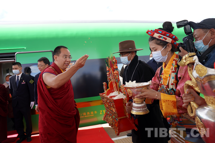 圖為班禪在火車(chē)站拋灑青稞、祈愿豐收 攝影:王淑