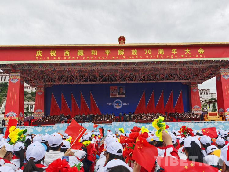 古城拉薩彩旗招展、花團(tuán)錦簇,處處洋溢著歡樂喜慶的節(jié)日氛圍。雄偉的布達(dá)拉宮下,搭建起藏式風(fēng)格的大會主席臺。主席臺上方,莊嚴(yán)的國徽和“慶祝西藏和平解放70周年大會”橫幅分外醒目,背景墻上懸掛著大慶會徽和“1951”“2021”字樣,10面紅旗分列兩側(cè)。主席臺對面的布達(dá)拉宮廣場上,身著節(jié)日盛裝的各族群眾從四面八方早早匯聚到這里,揮舞著手中的國旗、花束,匯聚成一片歡樂的海洋。