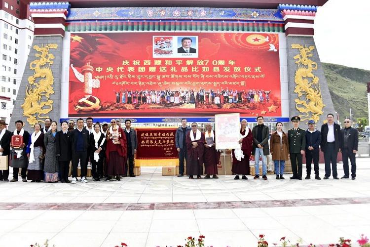 中國西藏網(wǎng)訊 為表達(dá)以習(xí)近平同志為核心的黨中央的親切關(guān)懷和全國人民的深情厚誼,出席西藏和平解放70周年慶?;顒拥闹醒氪韴F(tuán)向西藏贈送多項(xiàng)紀(jì)念品。8月23日下午,西藏自治區(qū)那曲市比如縣隆重舉行中央代表團(tuán)贈送禮品發(fā)放儀式。