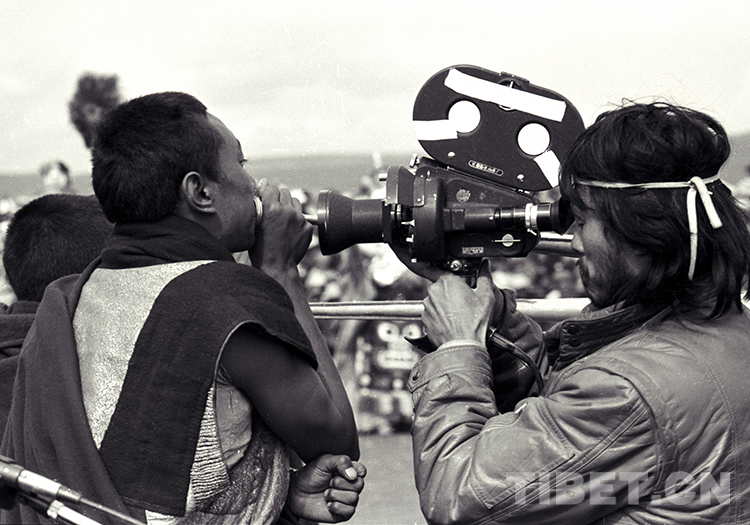 這是北京科學(xué)教育電影制片廠《萬里藏北》攝制組在那曲賽馬會上拍攝吹長號的僧人(唐召明1987年攝)