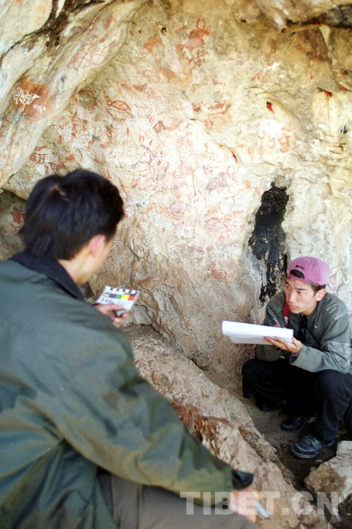 這是藏北無人區(qū)科考團(tuán)科考人員在對班戈縣洞窟巖畫進(jìn)行科學(xué)考察(唐召明2001年攝)