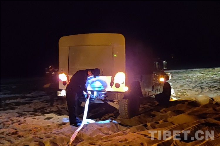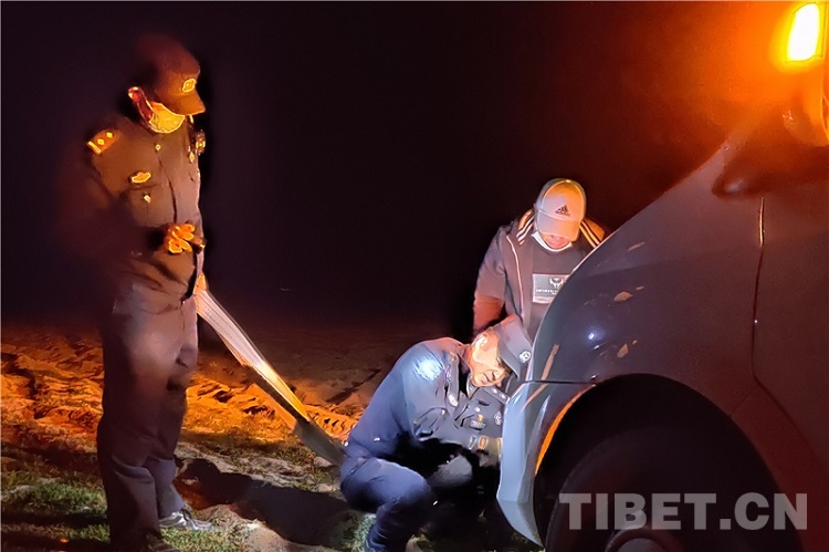 據(jù)了解,3名游客在自駕游玩過(guò)程中,想前往拉昂錯(cuò)湖邊停留一會(huì)再前往縣城。由于天黑視線模糊,在湖邊行駛時(shí)誤入沙地,立即開(kāi)始倒車自救,但由于沙土松軟,車輛左右搖擺,越陷越深。在觀察、詢問(wèn)無(wú)人員受傷或身體不適后,救援民警立即開(kāi)展救援工作。