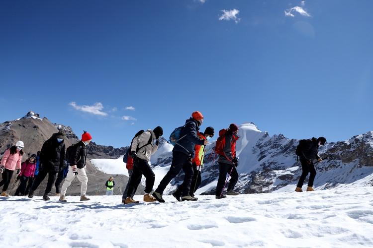 楊女士進(jìn)藏已有半月,在專業(yè)人士的協(xié)助下她第一次近距離接觸了冰雪世界,并攀登到了海拔5600米的地方。“今天我沒(méi)有高原反應(yīng),帶的氧氣也沒(méi)用?!痹谘┥缴蠗钆康呐d奮之情溢于言表。