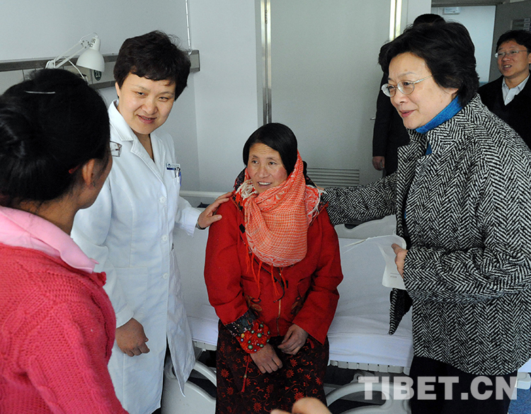 這是時(shí)任全國(guó)婦聯(lián)副主席甄硯(右一)受時(shí)任十一屆全國(guó)人大常委會(huì)副委員長(zhǎng)陳至立委托,到北京口腔醫(yī)院看望斯求卓瑪,并送來(lái)慰問(wèn)金(唐召明2010年4月14日攝)