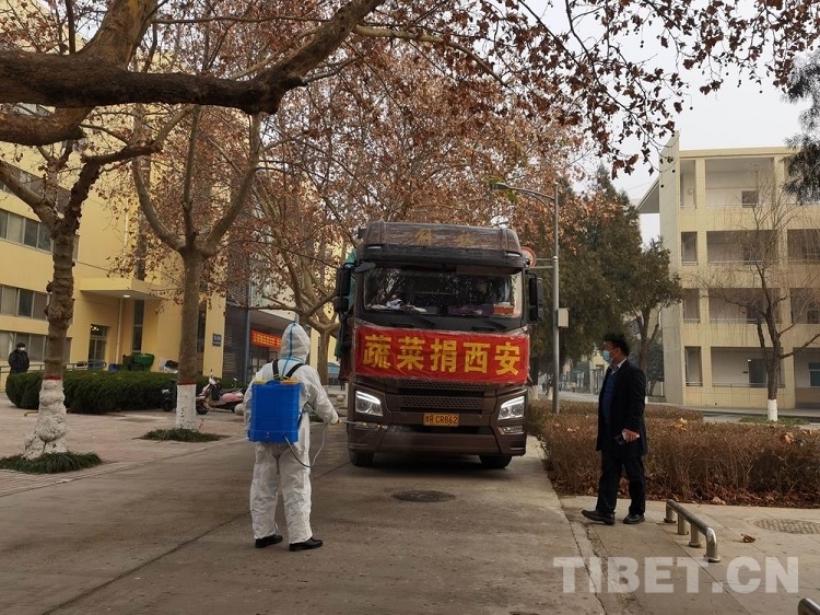 這是由河南南陽社區(qū)志愿者協(xié)會組織的馳援陜西的大卡車,兩位志愿者協(xié)會成員于2022年1月4日晚11時30分出發(fā),驅(qū)車千里一夜未眠,只為第一時間把新鮮蔬菜送到學(xué)校,助力抗疫。1月5日上午11時,在西藏民族大學(xué)第一餐廳廣場前,舉行了捐贈儀式。