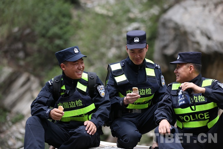 圖為聶拉木出入境邊防檢查站友誼橋執(zhí)勤點(diǎn)民警在巡邏休息的時(shí)候吃壓縮餅干 攝影:尼瑪?shù)┰?/p>