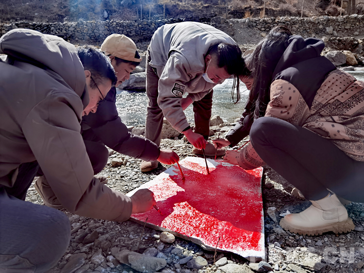 圖為卡熱鄉(xiāng)6個(gè)村(居)第一書記及邊據(jù)村駐村工作隊(duì)正在石頭上手繪國旗