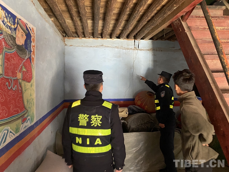 圖為林芝邊境管理支隊(duì)里龍邊境派出所民警在轄區(qū)群眾家中查看房屋受損情況 攝影/吳敏