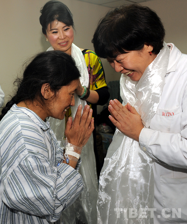 這是術(shù)后準(zhǔn)備出院的藏族婦女才塔爾(前左)在北京安貞醫(yī)院向為自己做手術(shù)、幫著捐款的醫(yī)生顧虹敬獻(xiàn)哈達(dá),并雙手合十致謝(唐召明2013年4月15日攝)